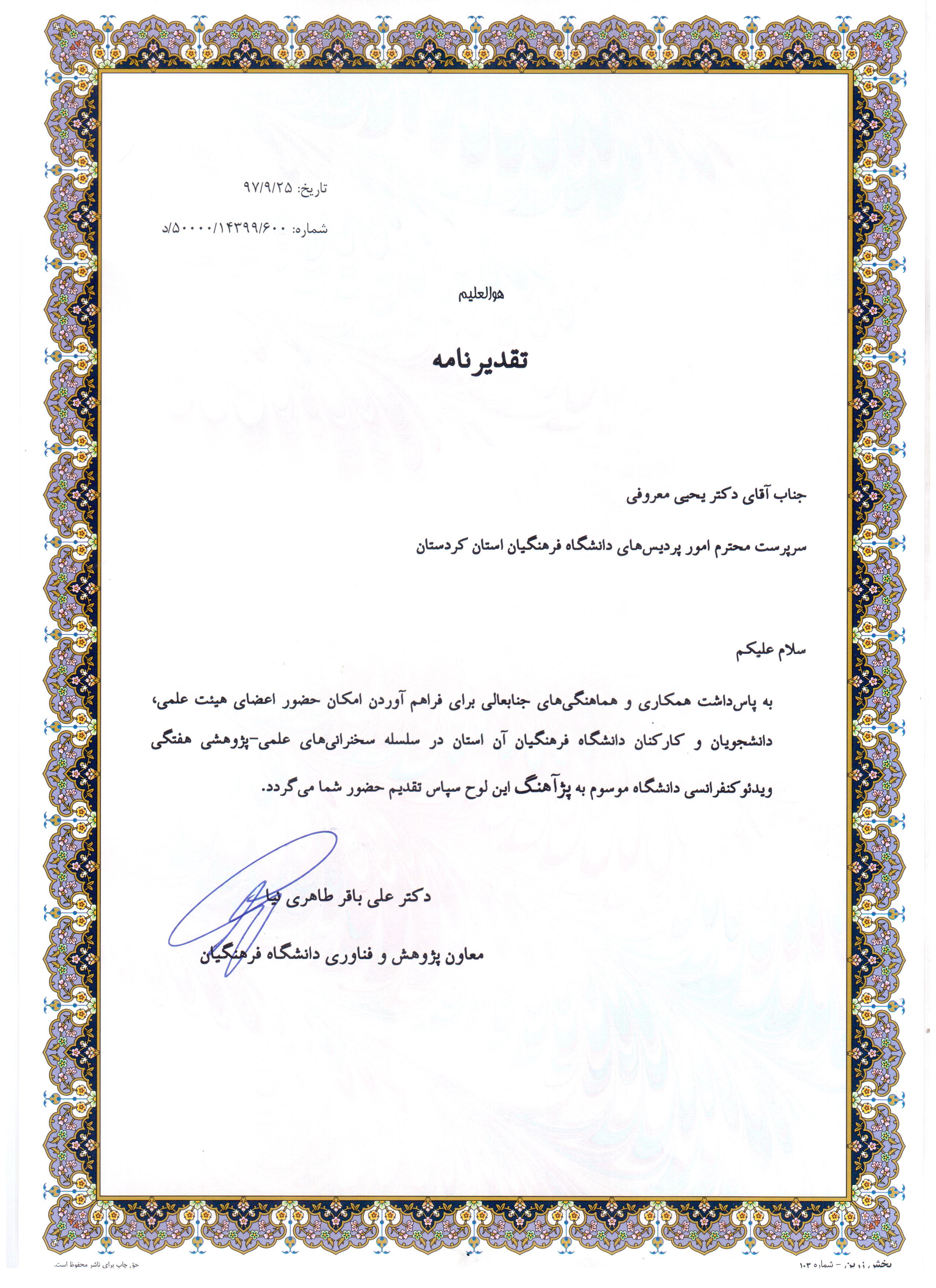 به گزارش روابط عمومی دانشگاه فرهنگیان کردستان، بر اساس اعلام معاونت پژوهشی دانشگاه فرهنگیان به پاس داشت همکاری و هماهنگی های ارزنده دکتر یحیی معروفی سرپرست محترم امور پردیس های دانشگاه فرهنگیان کردستان و همچنین شهلا احمدی و داریوش احمدی، کارشناسان کتابداری استان کردستان که مقدمات لازم برای بهره گیری حداکثری استادان، کارکنان و دانشجومعلمان در سلسه سخنرانی های علمی _ پژوهشی هفتگی ویدئو کنفرانسی دانشگاه موسوم به برنامه پژآهنگ را فراهم نموده اند، به عنوان فعالین برنامه مذکور در سطح کشور برگزیده شدند که در مراسم ملی هفته پژوهش دانشگاه فرهنگیان که در روزهای 27 و 28 آذر 1397 در استان قم برگزار شد تقدیر به عمل آمد دانشگاه فرهنگیان نیز این موفقیت را به این عزیزان پویا تبریک و تهنیت عرض نموده و موفقیت روز افزون را از خداوند متعال برای ایشان خواستاریم.
