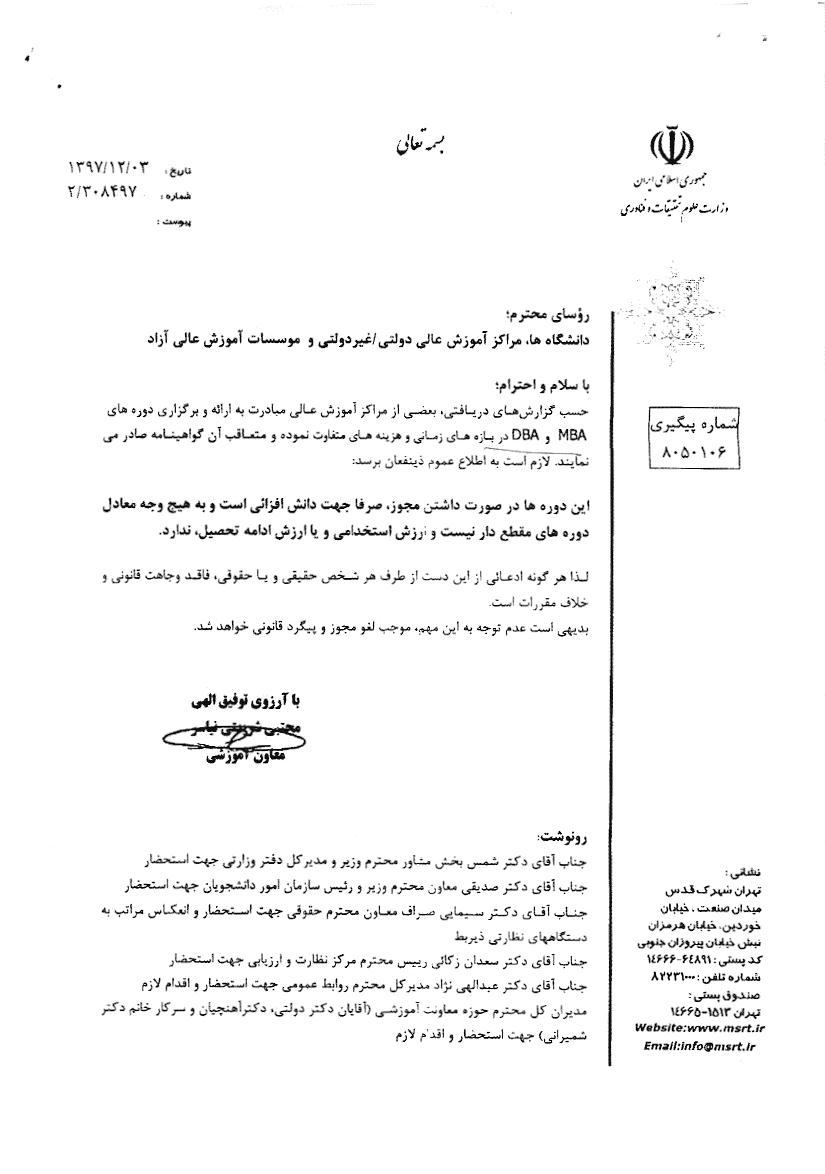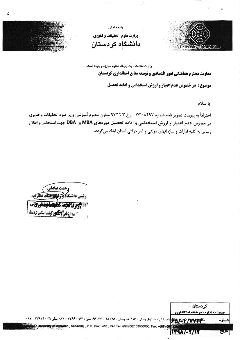 اطلاعیه معاون هماهنگی امور اقتصادی و توسعه منابع استانداری کردستان در خصوص عدم اعتبار و ارزش استخدامی و ادامه تحصیل در دوره های MBA و DBA