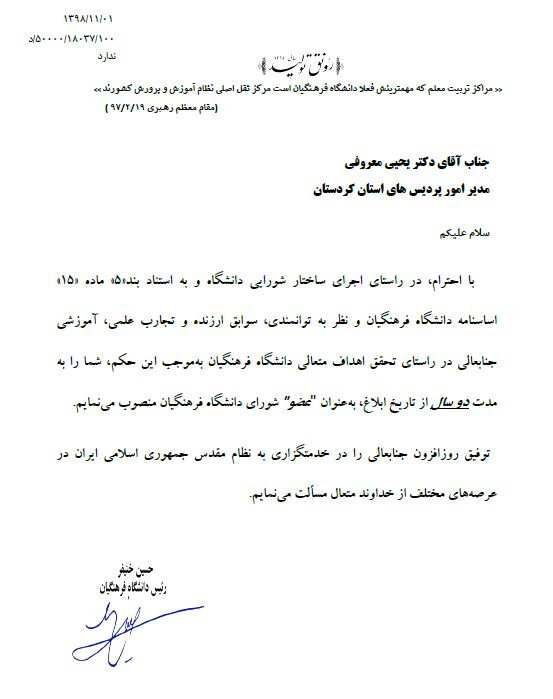 به گزارش روابط عمومی دانشگاه فرهنگیان استان کردستان؛در جلسه شورای دانشگاه که با حضور دکتر خنیفر رئیس دانشگاه فرهنگیان،در سازمان مرکزیبرگزار گردید، دکتر یحیی معروفی مدیر امور پردیس های دانشگاه فرهنگیان استان کردستان برای چهارمین بار به مدت دوسال به عنوان نماینده مدیران استانی در شورای دانشگاه انتخاب شد. روابط عمومی دانشگاه فرهنگیان استان کردستان ضمن آرزوی توفیق برای ایشان این موفقیت را به اساتید، کارکنان و دانشجو معلمان تبریک عرض می نماید.متن ابلاغ به شرح زیر می باشد.