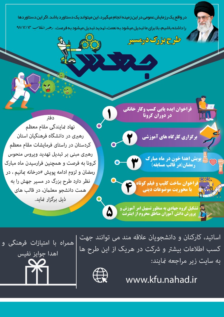 دفتر نهاد نمایندگی مقام معظم رهبری در دانشگاه فرهنگیان استان کردستان در راستای فرمایشات مقام معظم رهبری مبنی بر تبدیل تهدید ویروس منحوس کرونا به فرصت و همچنین فرارسیدن ماه مبارک رمضان و لزوم ادامه پویش #در_خانه_بمانیم، به همت دانشجو معلمان گرامی اقدام به برگزاری طرح بزرگ « در مسیر جهش» در قالب های ذیل، همراه با امتیازات فرهنگی و اهدا جوایز نفیس می نماید.