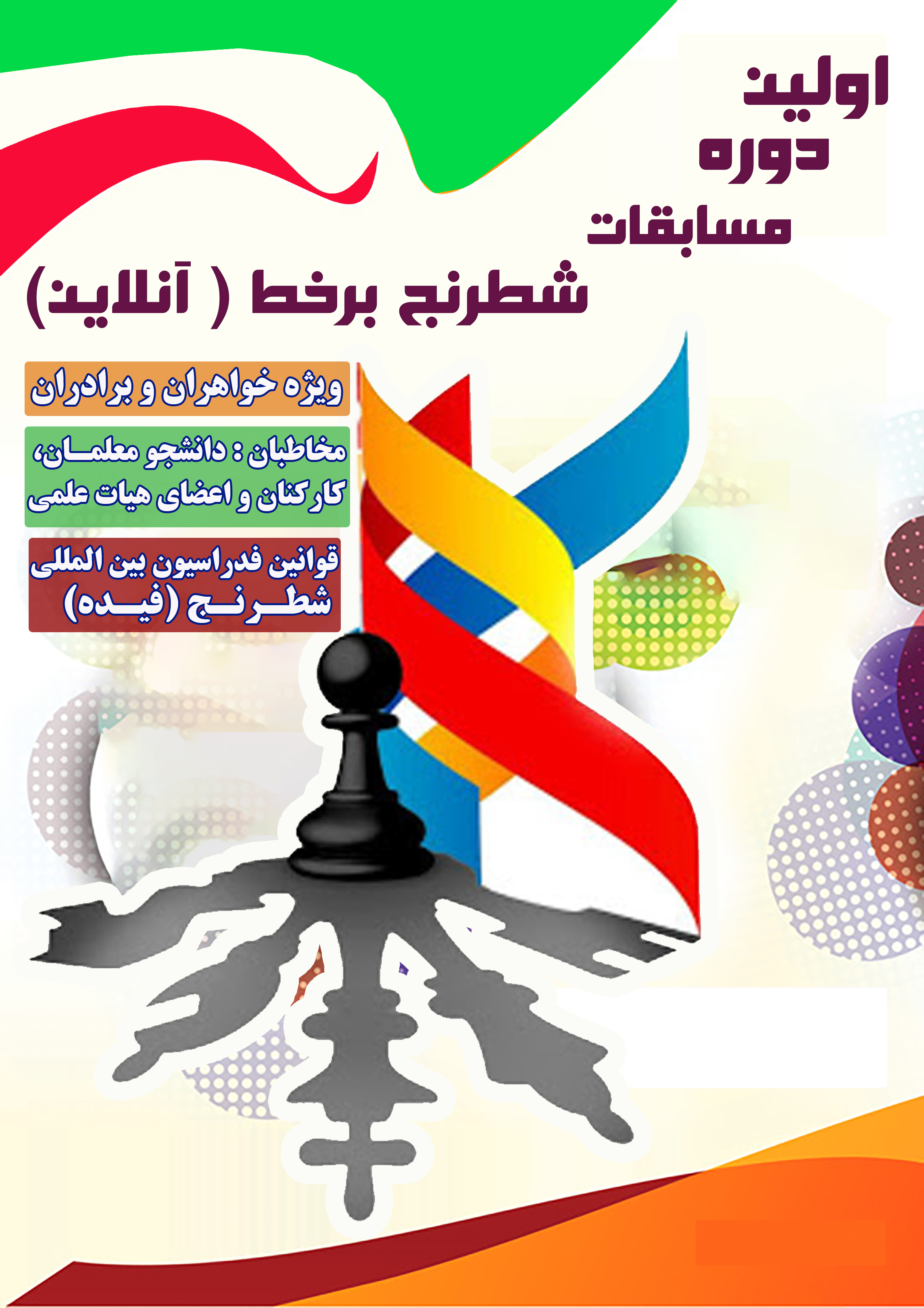 با توجه به شرایط کنونی کشور و تعطیلی غالب دانشگاه ها و مراکز آموزش عالی و به منظور حفظ نشاط و پویایی و غنی سازی اوقات فراغت و هم افزایی دانشجویان، اساتید و کارکنان، معاونت دانشجویی دانشگاه در نظر دارد اولین دوره مسابقات شطرنج برخط (آنلاین) را بصورت اینترنتی در بین دانشجو معلمان و اعضا هیات علمی و غیر هیات علمی برگزار نماید.