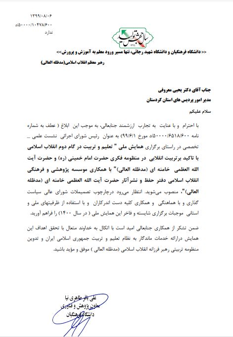 به گزارش روابط عمومی دانشگاه فرهنگیان کردستان ؛ با ابلاغ معاونت پژوهش و فناوری دانشگاه فرهنگیان کشور، دکتر یحیی معروفی مدیر امور پردیس های استان کردستان به عنوان رئیس شورای اجرائی نشست علمی – تخصصی همایش ملی " تعلیم و تربیت در گام دوم انقلاب اسلامی انتخاب شد.