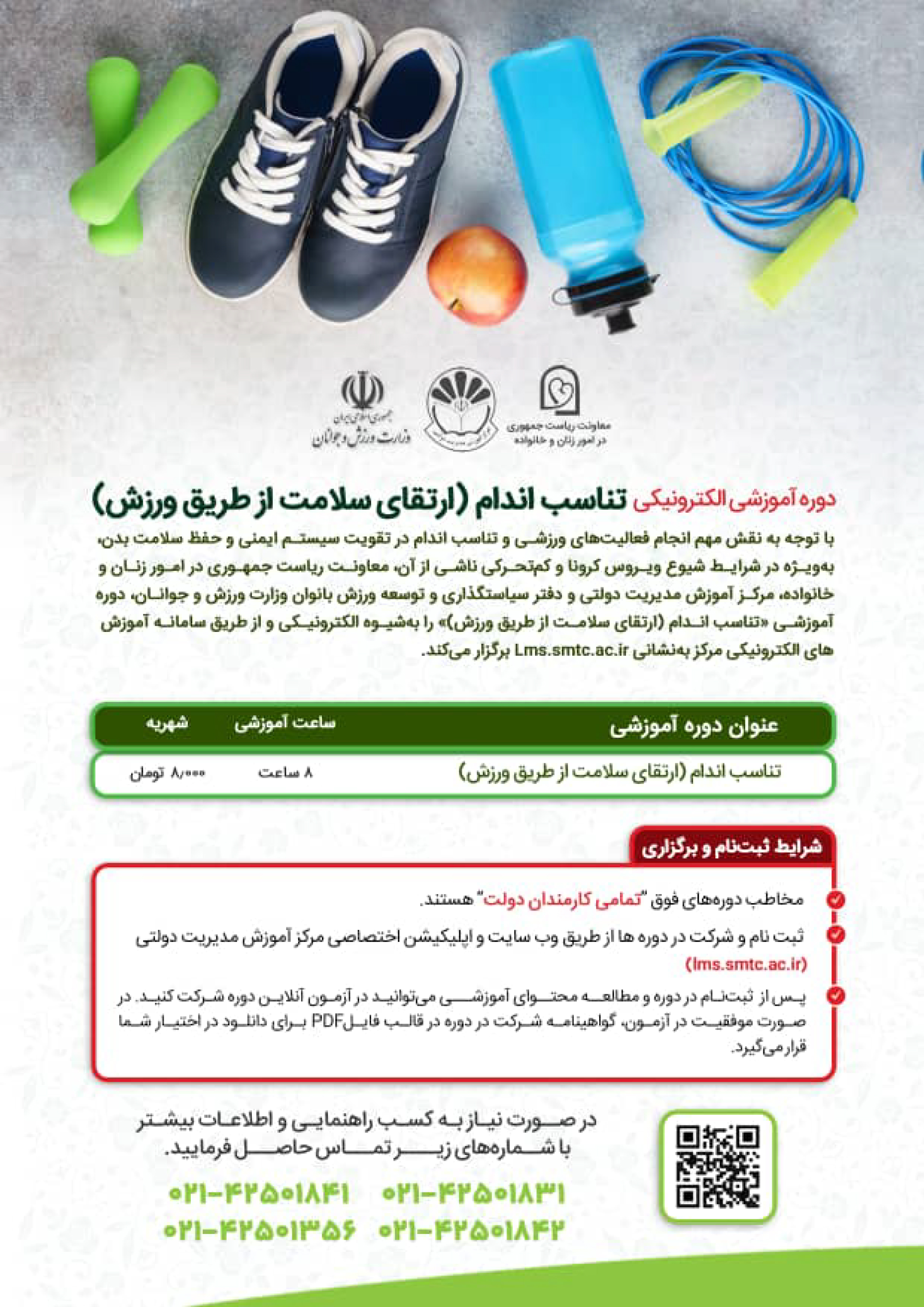 دوره تناسب اندام( ارتقای سلامت از طریق ورزش)، از دوره های آموزشی عمومی مصوب نظام آموزش کارکنان دستگاه های اجرایی کشور است که به مدت 8 ساعت آموزش نظری تدوین و برنامه ریزی شده است.