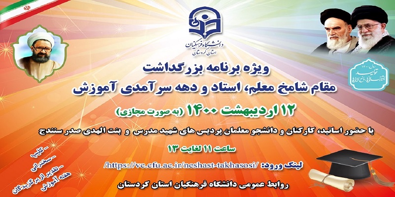 به گزارش روابط عمومی دانشگاه فرهنگیان کردستان؛ ویژه برنامه بزرگداشت مقام شامخ معلم، استاد و دهه سرآمدی آموزش به صورت مجازی برگزار می گردد.