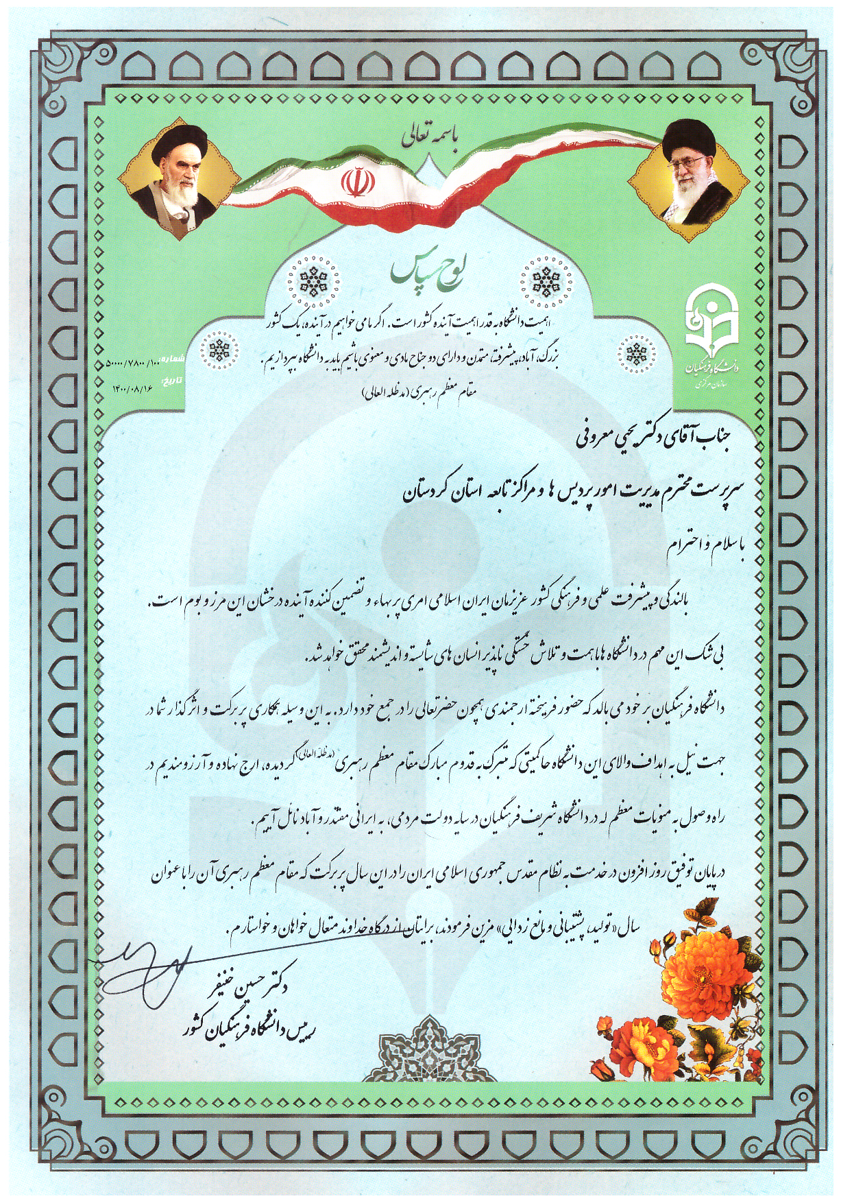 جا دارد این کسب افتخار را به مدیریت محترم استانی و تمامی همکاران خدوم دانشگاه فرهنگیان کردستان تبریک و تهنیت عرض نمائیم.