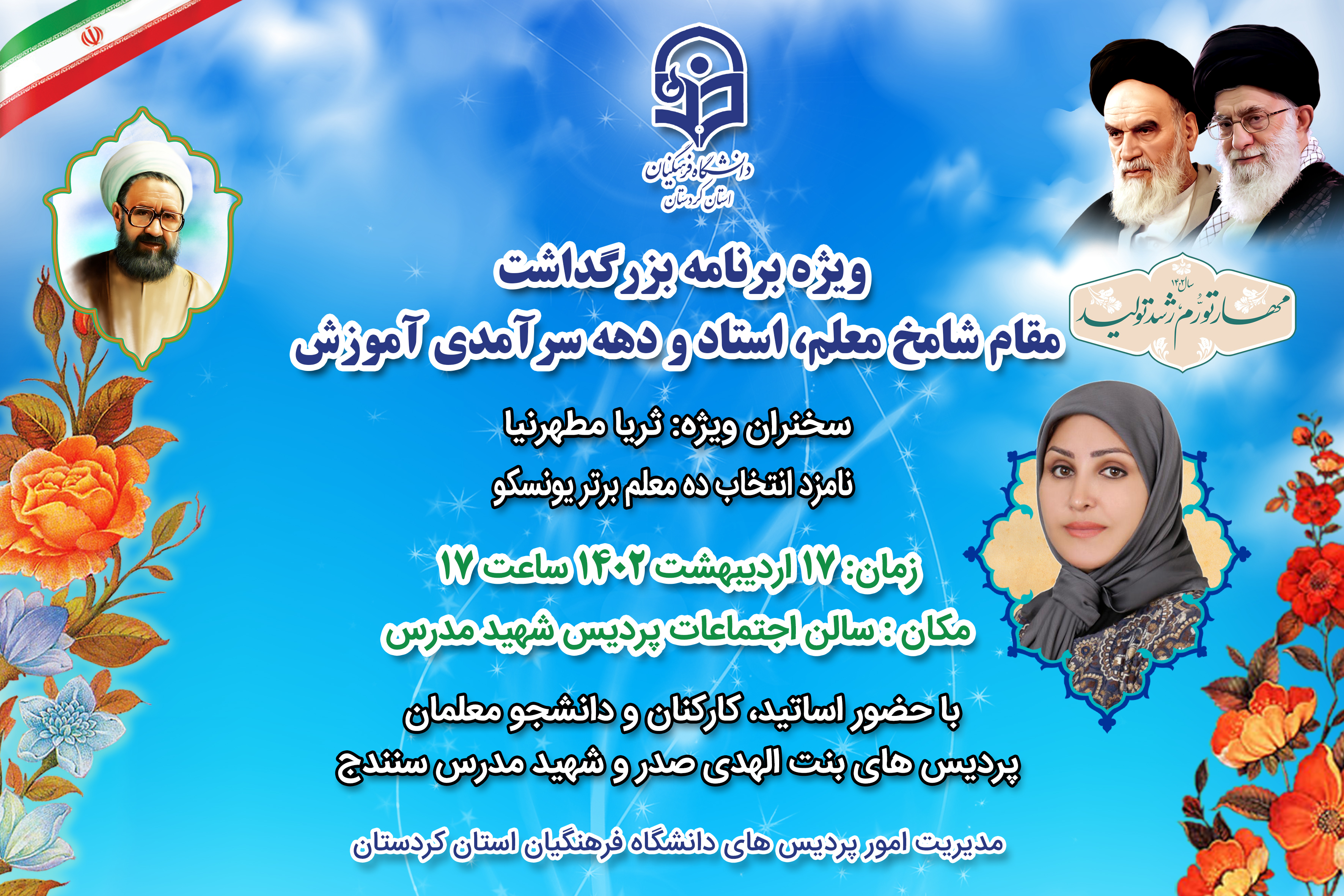 به گزارش روابط عمومی دانشگاه فرهنگیان استان کردستان؛ ویژه برنامه بزرگداشت مقام شامخ معلم، استاد و دهه سرآمدی آموزش با حضور ثریا مطهرنیا، یکشنبه 17 اردیبهشت ۱۴۰2 ساعت 17 در سالن اجتماعات پردیس شهید مدرس برگزار می گردد.