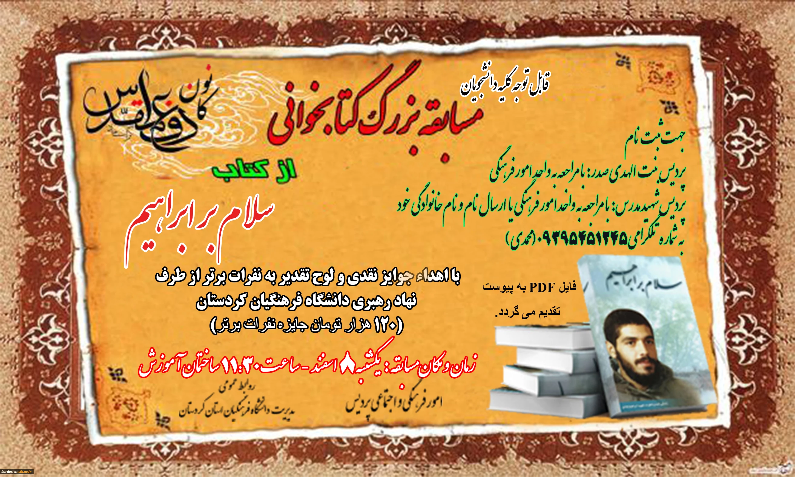امتیاز دهید : به مناسبت یادواره شهید حق وردی برگزاری مسابقه کتابخوانی 3 چهارشنبه 4 اسفند 1395 ساعت 19:08