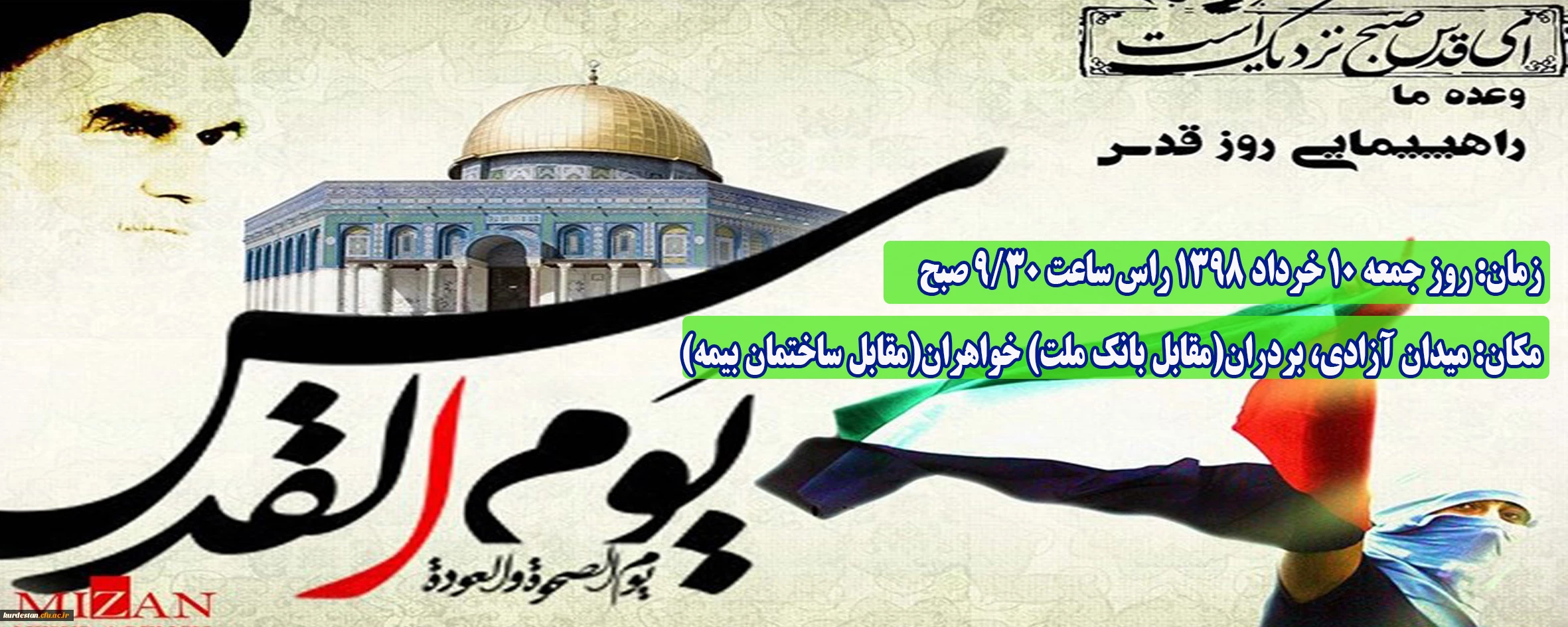 امتیاز دهید : اطلاعیه زمان و مکان تجمع اولیه راهپیمایی روز جهانی قدس 2 سهشنبه 7 خرداد 1398 ساعت 10:00