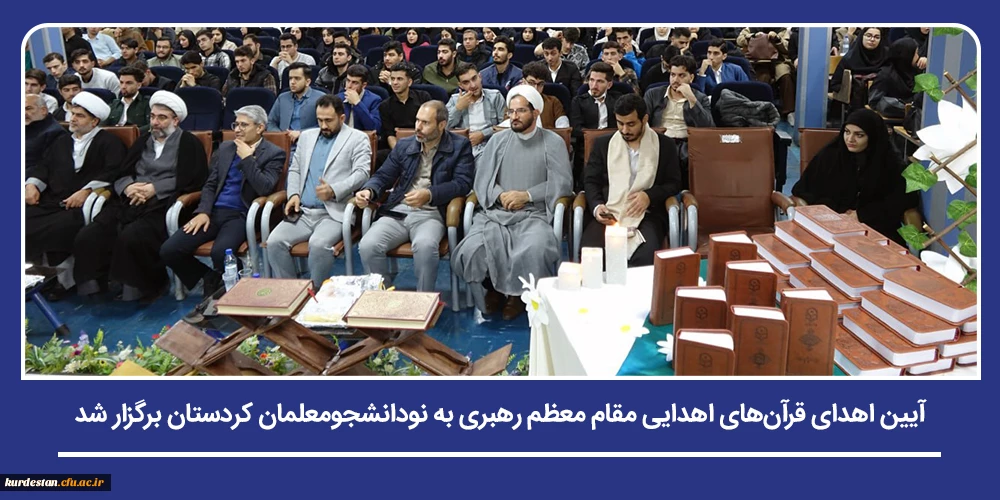 قرآن های اهدایی مقام معظم رهبری در آیینی با شکوه و در جمع نودانشجومعلمان دانشگاه فرهنگیان استان کردستان اهدا شد. این مراسم با حضور مسئول نهاد نمایندگی مقام معظم رهبری در دانشگاه های استان و رئیس دانشگاه فرهنگیان کردستان، و در فضایی معنوی و حماسی برگزار گردید.