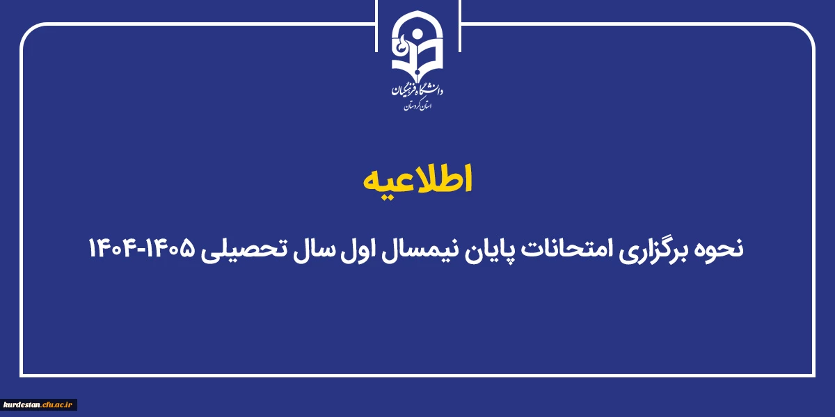 به اطلاع می رساند به استناد نامه شماره 295263/2 مورخ 1404/10/29  وزارت علوم، تحقیقات و فناوری، امتحانات پایان نیمسال اول سال تحصیلی 1405-1404 دانشگاه فرهنگیان سراسر کشور در تمامی مقاطع تحصیلی به صورت غیر حضوری طبق برنامه قبلی از تاریخ 4 بهمن 1404 و از طریق سامانه LMS  برگزار می شود.